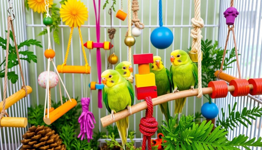Keeping your parakeet active and entertained is key for their health. A lively environment helps avoid boredom, stress, and bad behavior. It’s important to offer many parakeet toys and fun activities that match their natural instincts.